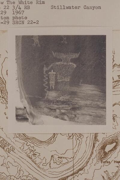 Pictograph on the up-river of two large boulders at the foot of the talus below the White Rim; Mile 22 3/4, right bank, Stillwater Canyon