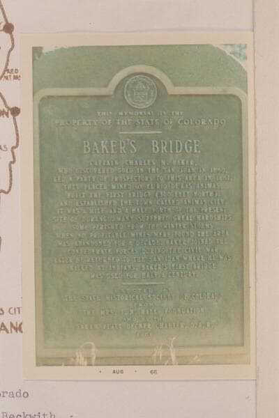 Plaque placed by the State Historical Society of Colorado at Baker's Bridge