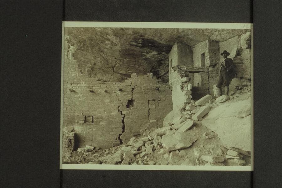 A glimpse into the interior of one of the houses. Note the cracked walls and cedar logs built in--used probably to support a walk or balcony