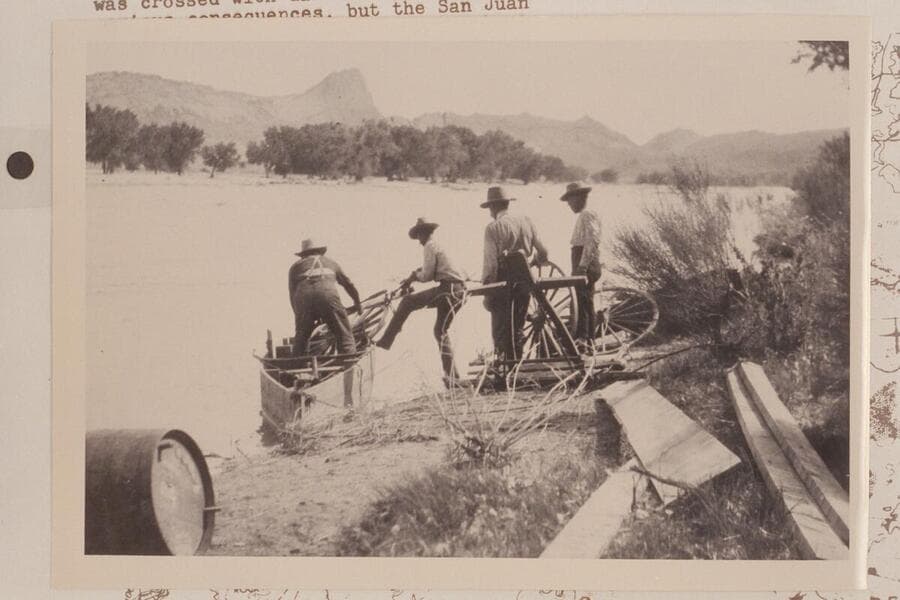 Loading wagon party into the make-shift boat on the San Juan River at the ford some miles below Bluff