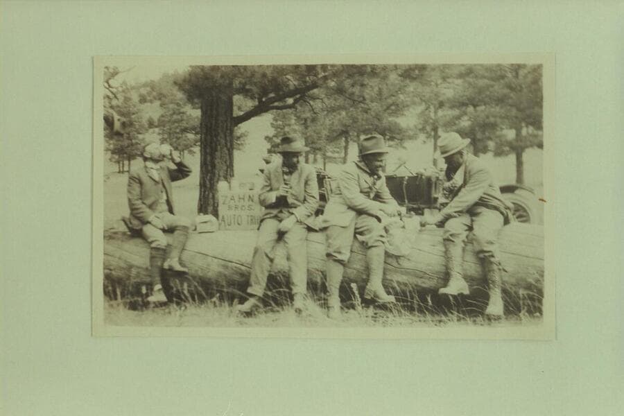 The Zahn party stopping for lunch at the pass over the arm of the San Francisco Mountains. They took their Franklin car from Los Angeles to the Zahn Mine on the San Juan River in 1915, Sep