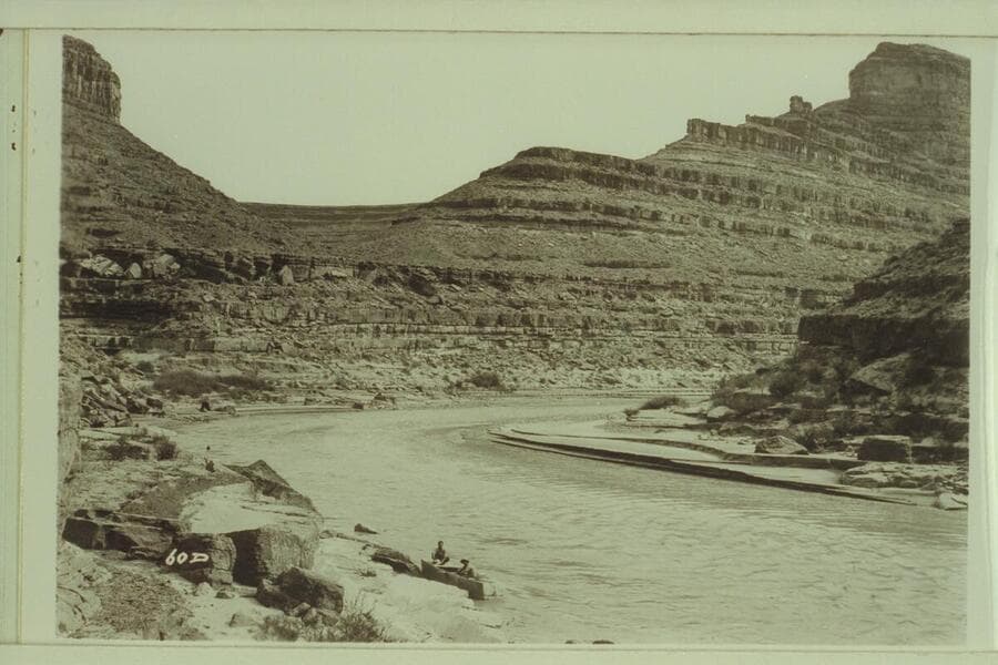 Nevills run from Sand Island to Mexican Hat; San Juan River. The punt bears the name "Nevills" on the stern. Upstream from near head of gorge