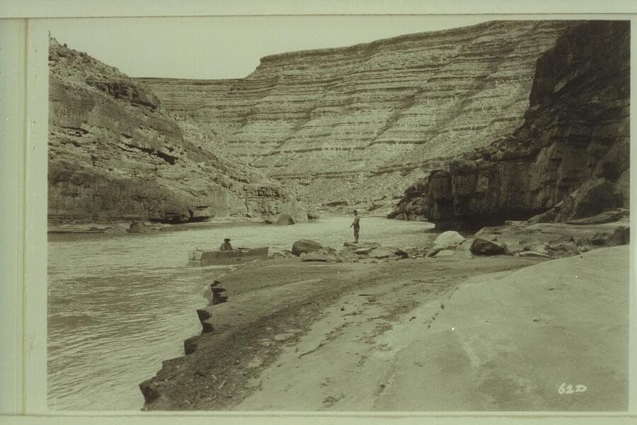 Nevills run from Sand Island to Mexican Hat; San Juan River. The punt bears the name "Nevills" on the stern. Upstream from near head of gorge