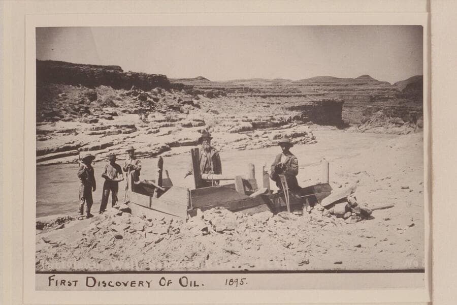 First discovery of oil at Mexican Hat. Photo captioned, "Petroleum Well, San Juan River, Utah"