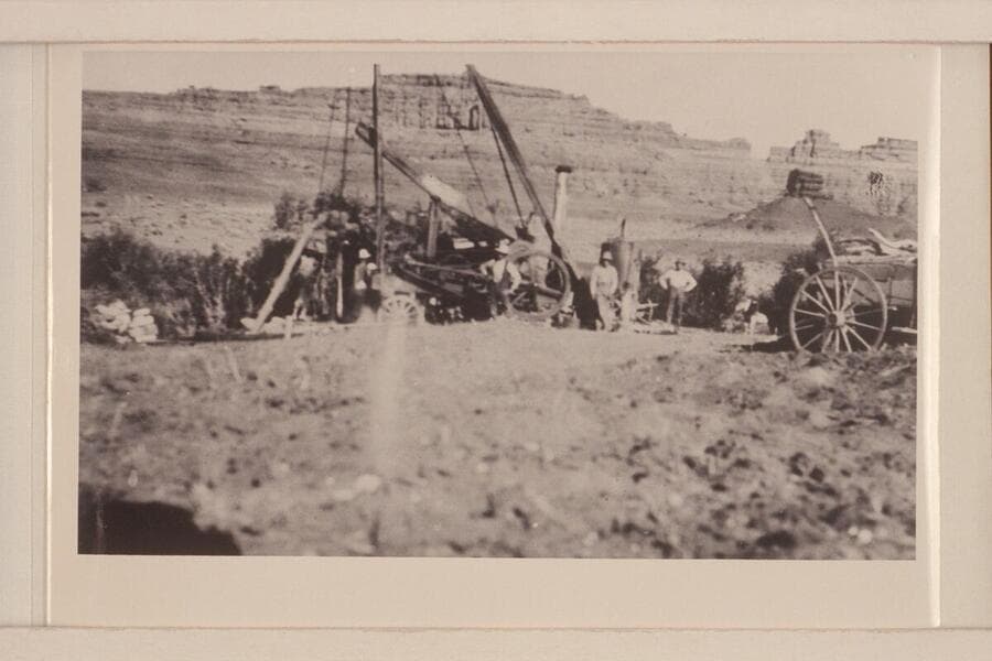 First discovery of oil at Mexican Hat. Photo captioned, "Petroleum Well, San Juan River, Utah"