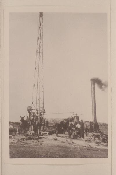 Harshberger rig; Mexican Hat oil field. The negative shows the rock of Mexican Hat at the extreme right