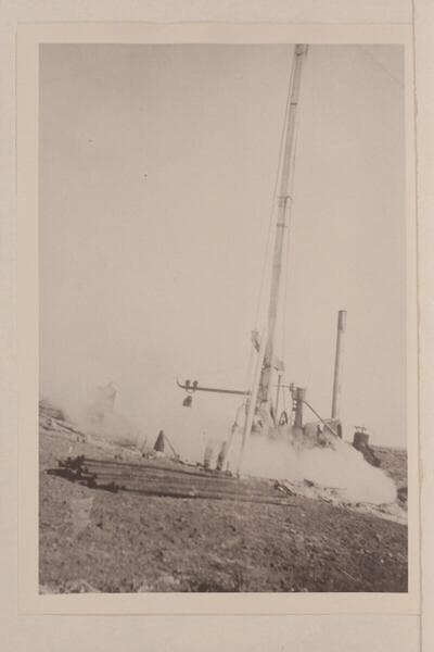 Harshberger rig; Mexican Hat oil field. The negative shows the rock of Mexican Hat at the extreme right