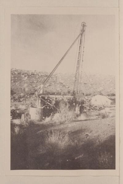 Harshberger rig; Mexican Hat oil field. The negative shows the rock of Mexican Hat at the extreme right