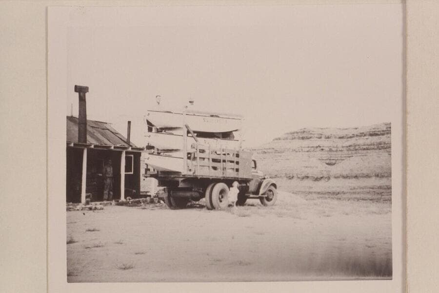 The three Nevills' sadirons on truck ready to start for Green River, Wyoming. In front of Nevills' residence at Mexican Hat