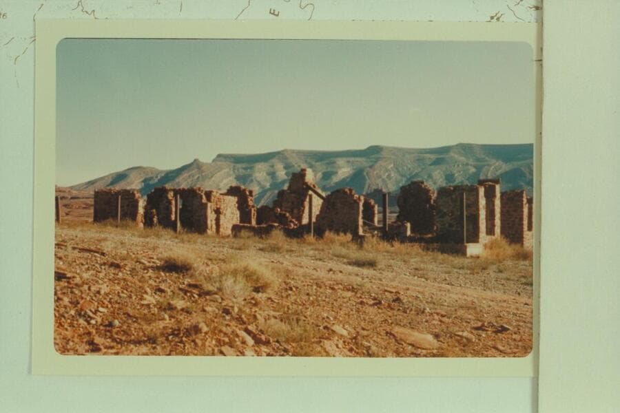 Raplee Anticline at Mexican Hat on the San Juan River. Nevills home at right. One of the Nevills boats is on the trailer back of the car