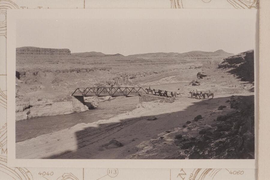 Spencer pack outfit at the bridge across the San Juan River below Mexican Hat. C. H. Spencer leading on his horse "Chunk." He remarked at the time that it was the first time in his many crossings of the San Juan that he felt safe