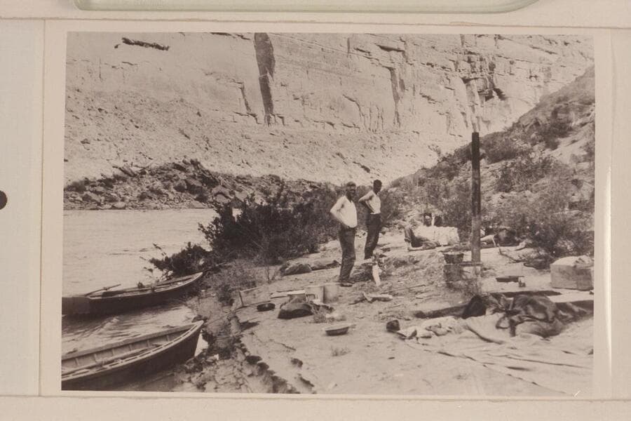 Camp below Mendenhall Loop where flood drove us out. Loper with bedding. Left to right: Loper; Hyde; Trimble; Christensen; Blake; Miser