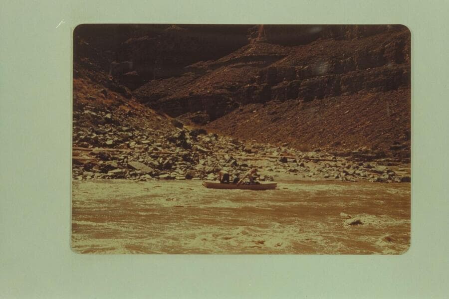 The Nevills San Juan punt with George Wing at the oars is freed from the rock near Johns Canyon. Mexican Hat gauge: 1190 cfs