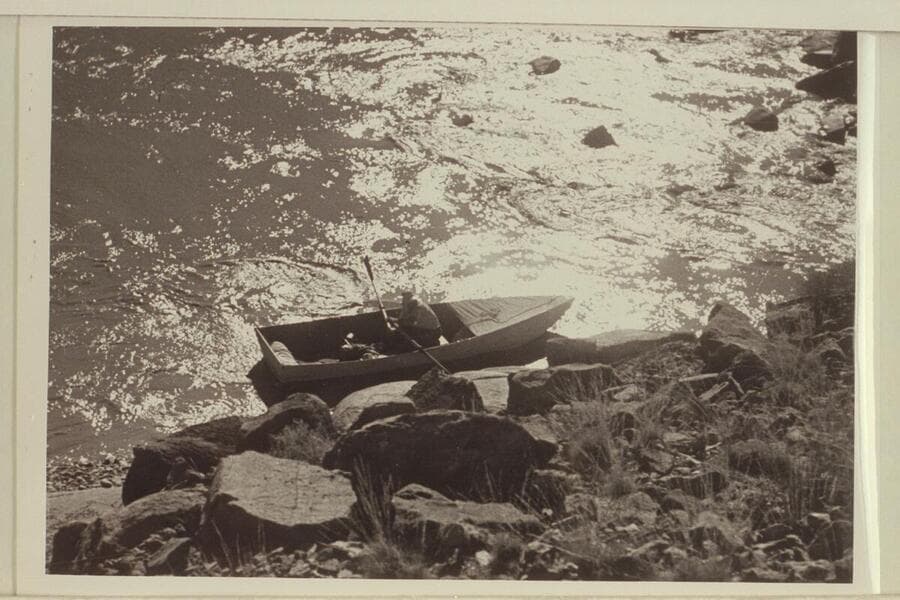 Lorin Bell in Government Rapid, San Juan River. 15-ft. folding spruce boat of the Monument Valley-Rainbow Bridge Expedition borrowed by Nevills