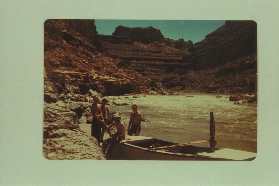 Frost party on the San Juan. Second trip of 1947. Left to right: Sam Stone; Frank E. Frost (boatman); Claude Lortz is sitting on boat; Robert L. Gates (boatman). Just below Government Rapid after running it