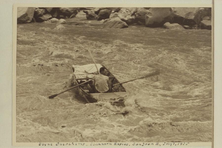 Jack near the bottom of Slickhorn Rapid. Jack Wimpress in the "Black Submarine" or "Ugh Ptui."