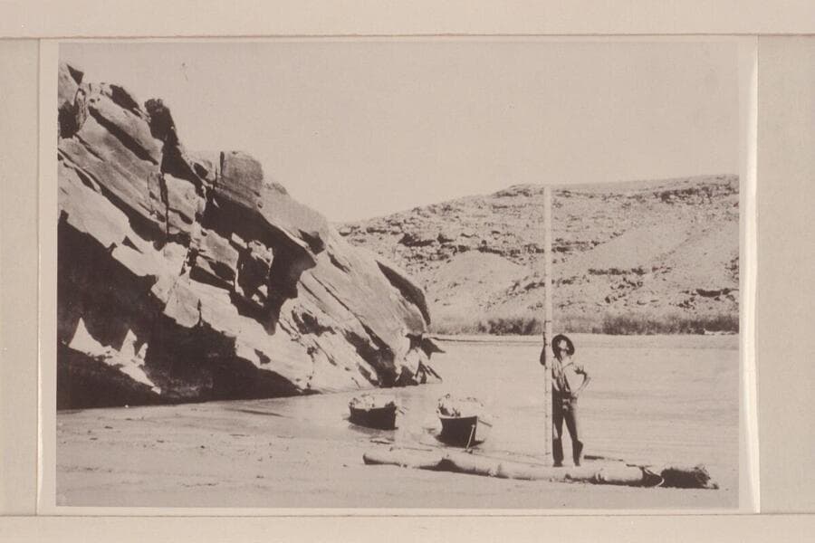 Point on San Juan half a mile north of mouth of Nokai Creek. Looking southeast across the river. DeChelly sandstone in left foreground. Shinarump conglomerate and terrace gravels in distance