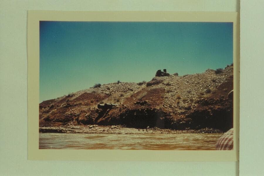 Old boiler at top of gravel bar and discharge pipes below Zahns Camp. San Juan River