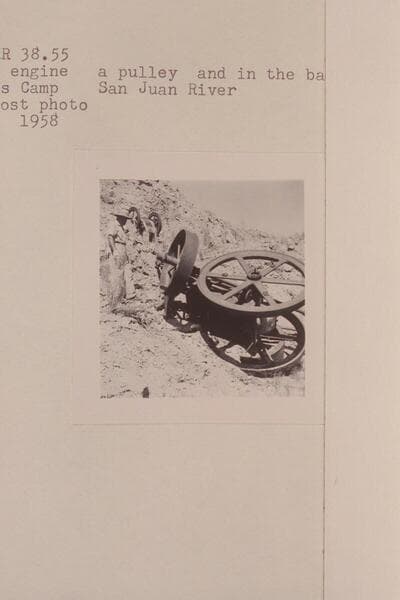 The gas engine, a pulley and in the background- the rock crusher. Spencer's Camp, San Juan River