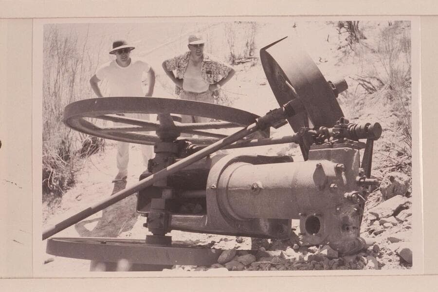 Members of the Jack Frost party at the engine at Spencer's Camp