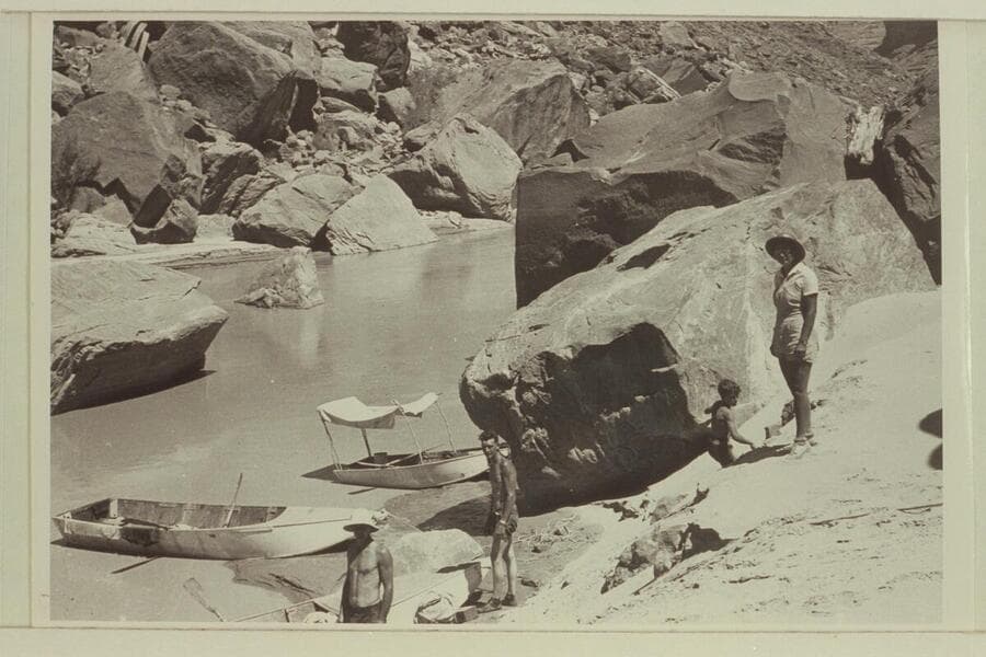 San Juan River trip of 1938. Two of the 15 foot folding boats and one 10 foot boat. L to R: ___, Kent Frost, Jackie Frost and Elzada Clover