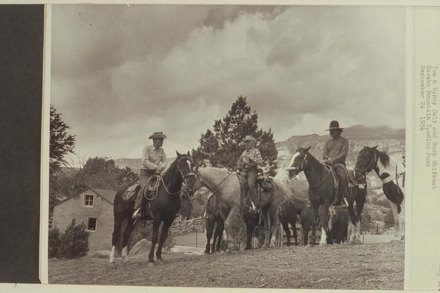 Tom Daly, Nancy Daly and Buck Whitehat about to leave the Navajo Mt. Trading Post with the stock