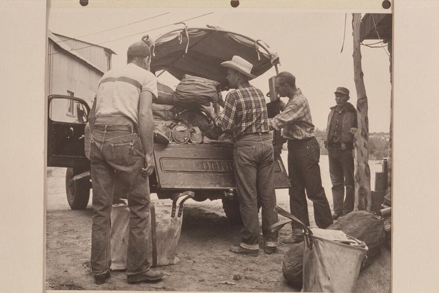 Loading the Power Wagon to run out to the edge of Rainbow Plateau to meet the stock- Ralph Cameron, Bill Belknap, Jorgen Visbak and Bahe; Navajo Mountain Trading Post