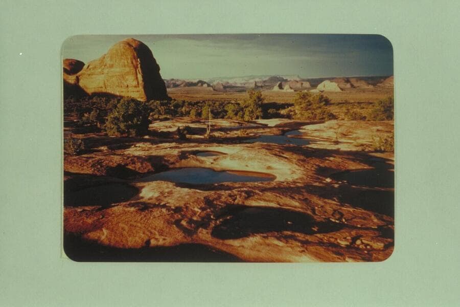 Pools in the slickrock in Bisha Canyon. Navajo Mt. in background