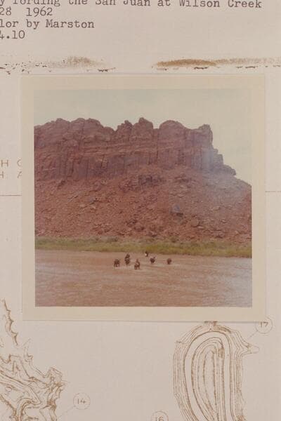 Toby Owl and Oliver Johnson landing at left bank of the San Juan after fording from the mouth of Wilson Creek