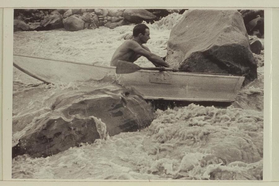 Lorin Bell in Government Rapid, San Juan River. 15-ft. folding spruce boat of the Monument Valley-Rainbow Bridge Expedition borrowed by Nevills