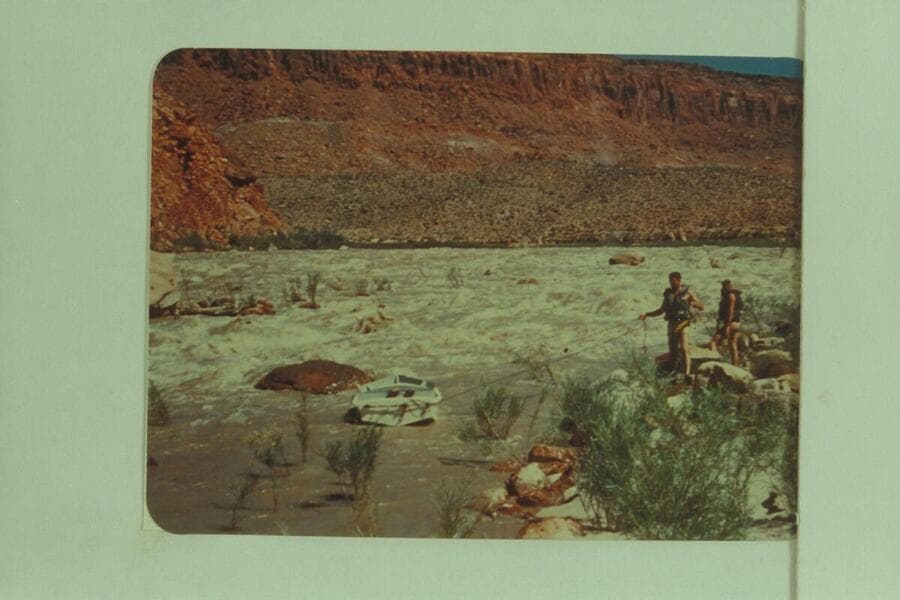 Don Wimpress and Jack Wimpress at the lining of 13-Foot Rapid, San Juan River