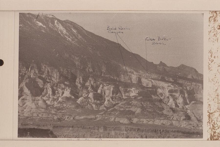 Mouth of Cha Canyon at lower left, Bald Rock Canyon, Cha Butte. From bench mark on Gray Mesa