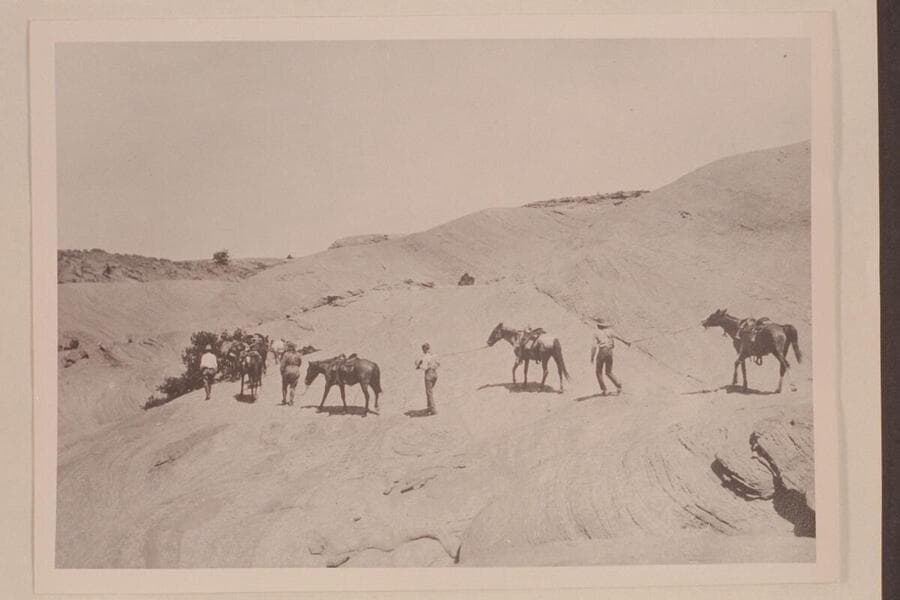 Roosevelt-Wetherill party. Trail to Rainbow Bridge. Archie is at the rear; Theodore is third from right. En route to Rainbow Bridge on bald rock east of Bald Rock Canyon and north of Cha Bottom