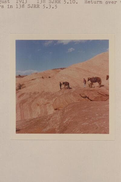 Leading stock past narrow ledge on bald rocks between Little Junction Creek and Bald Rock Creek