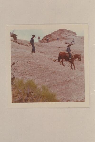 Dan Lehi rides down the slick rock and Toby Owl leads his mule while the dudes run cameras. The trail is between Bald Rock Creek and Nasja Creek