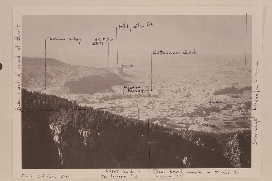 Fifty Mile Mountain. Sixty Mile Point. Drainage to Music Temple left of center. From plateau west of Nasja Creek at overlook to San Juan River