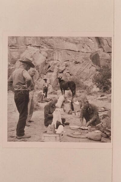 Camp in Bald Rock. Junction. Cha Creek. Noel Morss at left; Josh Eisaman; Nan Lehi Willetson; Archeyes Masland; Bill Belknap