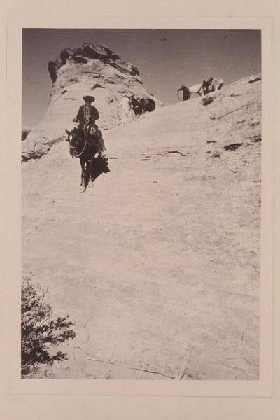 Dan Lehi rides down the slick rock and Toby Owl leads his mule while the dudes run cameras. The trail is between Bald Rock Creek and Nasja Creek