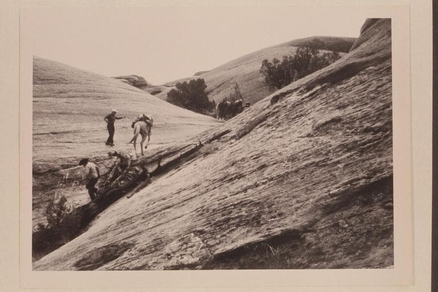 Bill Belknap leads his horse out the slickrock trail west of Nasja Creek