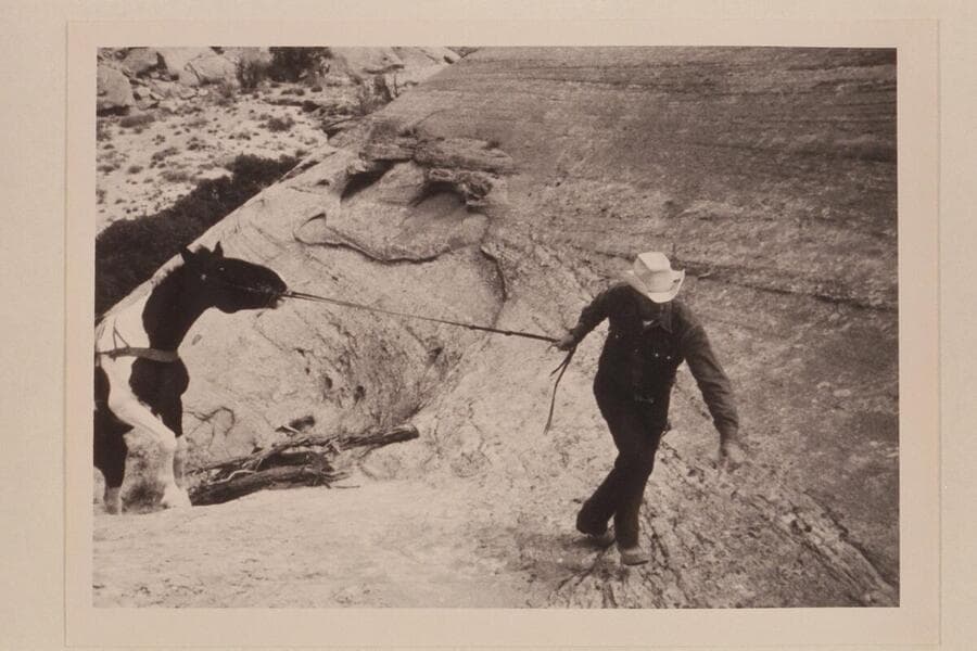 Bill Belknap leads his horse up slickrock west of Nasja Creek