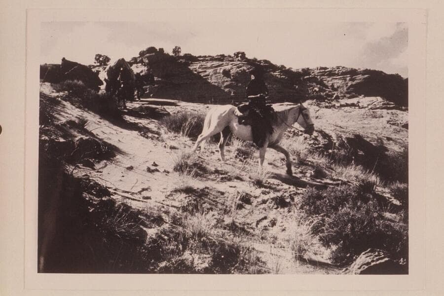 Tobe Owl watches repairs to Tom's horse. On trail west of Nasja Creek