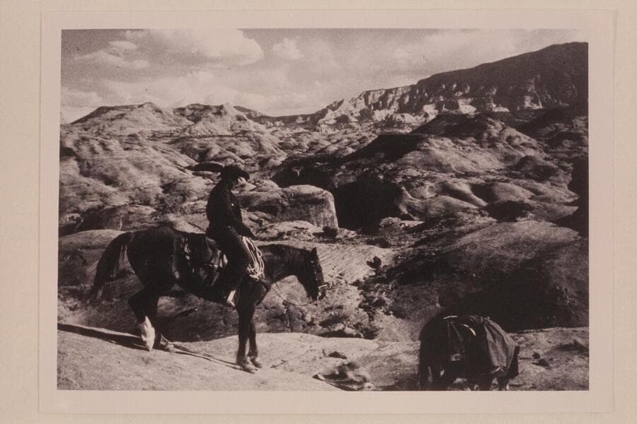 Dan Lehi rides down the slick rock from the rim of the mesa west of Nasja Creek. Cha Butte is upper left. Navajo Mountain is upper right. The sloping mesa at upper right is 4903. Nasja Creek is center