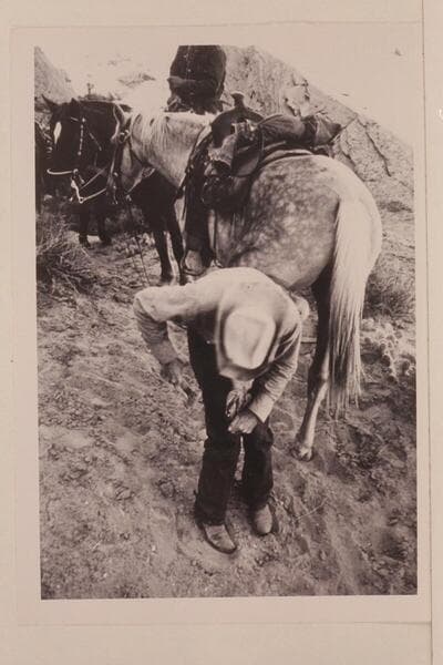 Tom shoes a horse on trail between Nasja Creek and Bald Rock Creek