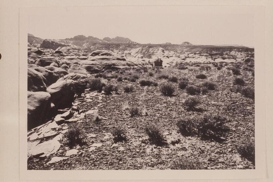 Butte 6069 on skyline at left as it appears from top of flat north of Cha Butte. The canyon beyond the flat mesa is Bald Rock. The end of Cummings Mesa is upper right