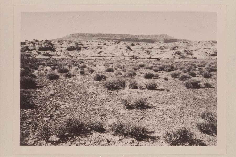 Fifty Mile Mountain from mesa north of Cha Butte. The canyon immediately beyond the flat mesa is Bald Rock, and Nasja Canyon is this side of the barrier of rocky buttes. 60 Mile Point runs out below Fifty Mile Mountain