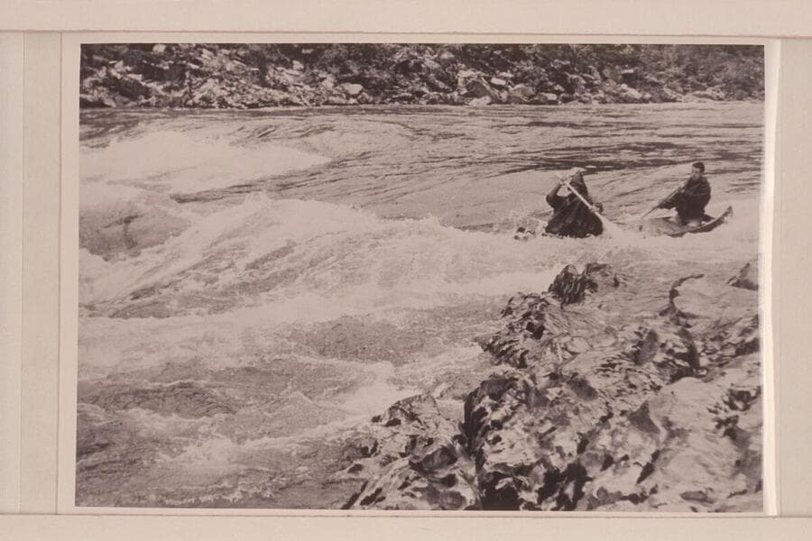 Canoe entering Grave Creek Falls in traverse of Rogue River by six UC students in 1954. "The canvas deck allows the high, curling waves to sweep across without swamping the canoe."