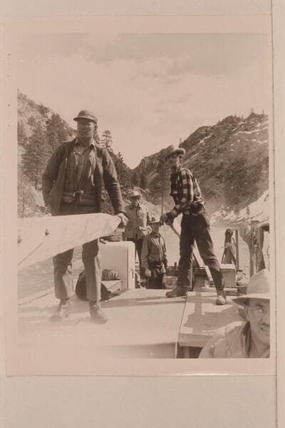 The sweep-scow threads among the rocks of the Salmon River, Idaho. Carl Kriley and Don Smith at the sweeps