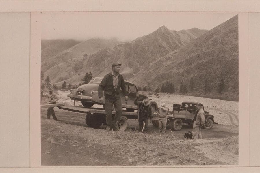 The heavy truck and trailer designed for hauling the scow back to Salmon City also freights the car of passengers around to the end of the trip. Don Smith is foreground