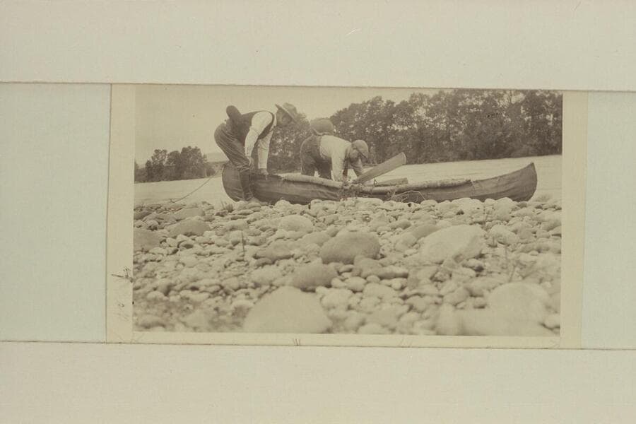 The canoe used in the Rogue River traverse swamps. Appears to be one place where the high canvas deck did not take all the high, curling waves across