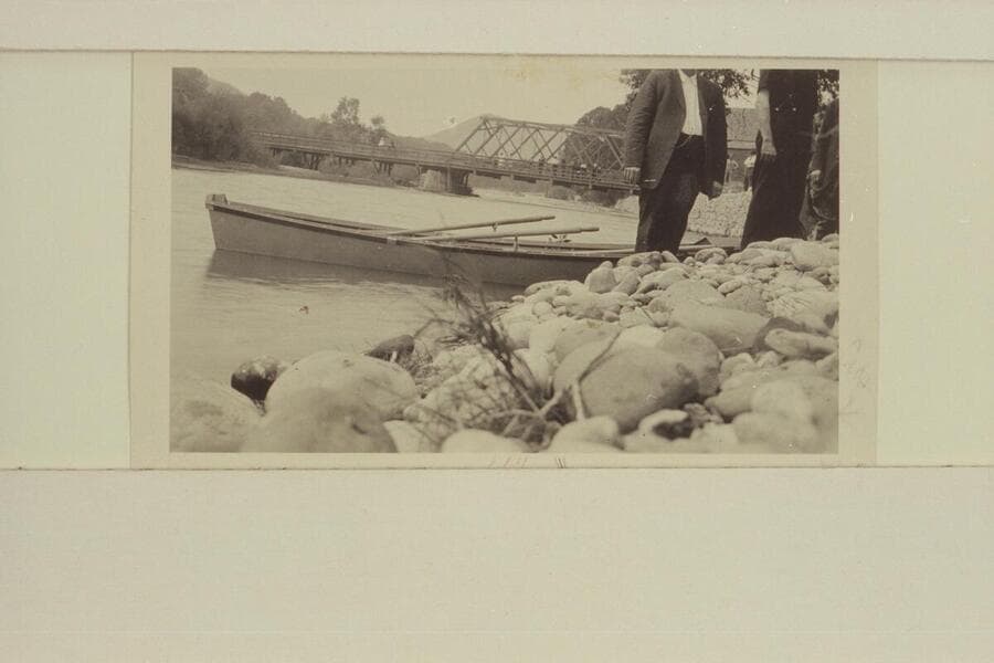 The "LiVingston, Mont."--open steel skiff used by Lewis R. Freeman on Yellowstone. Captioned: "We Launched the Boat Below the LiVingston Bridge."